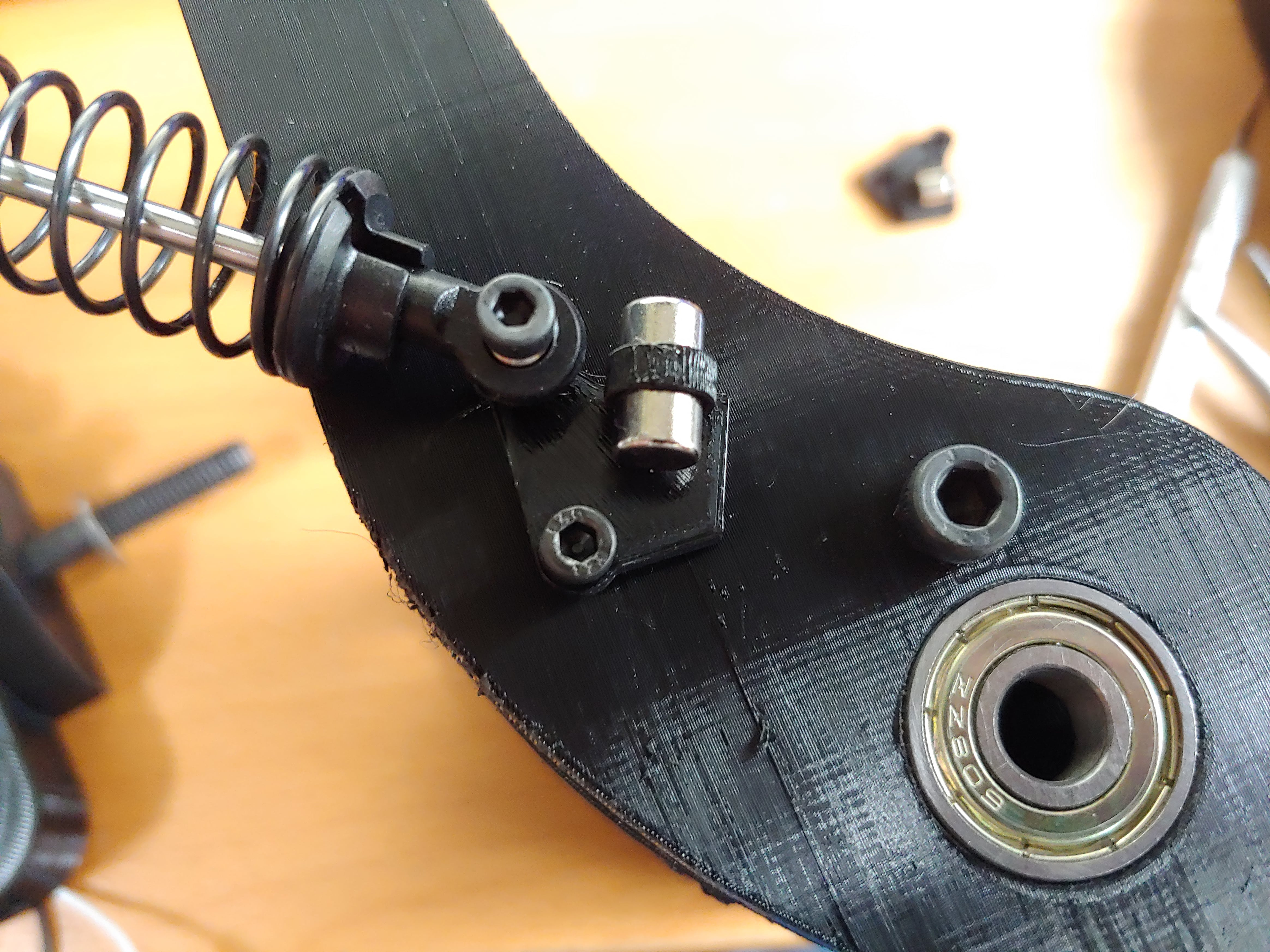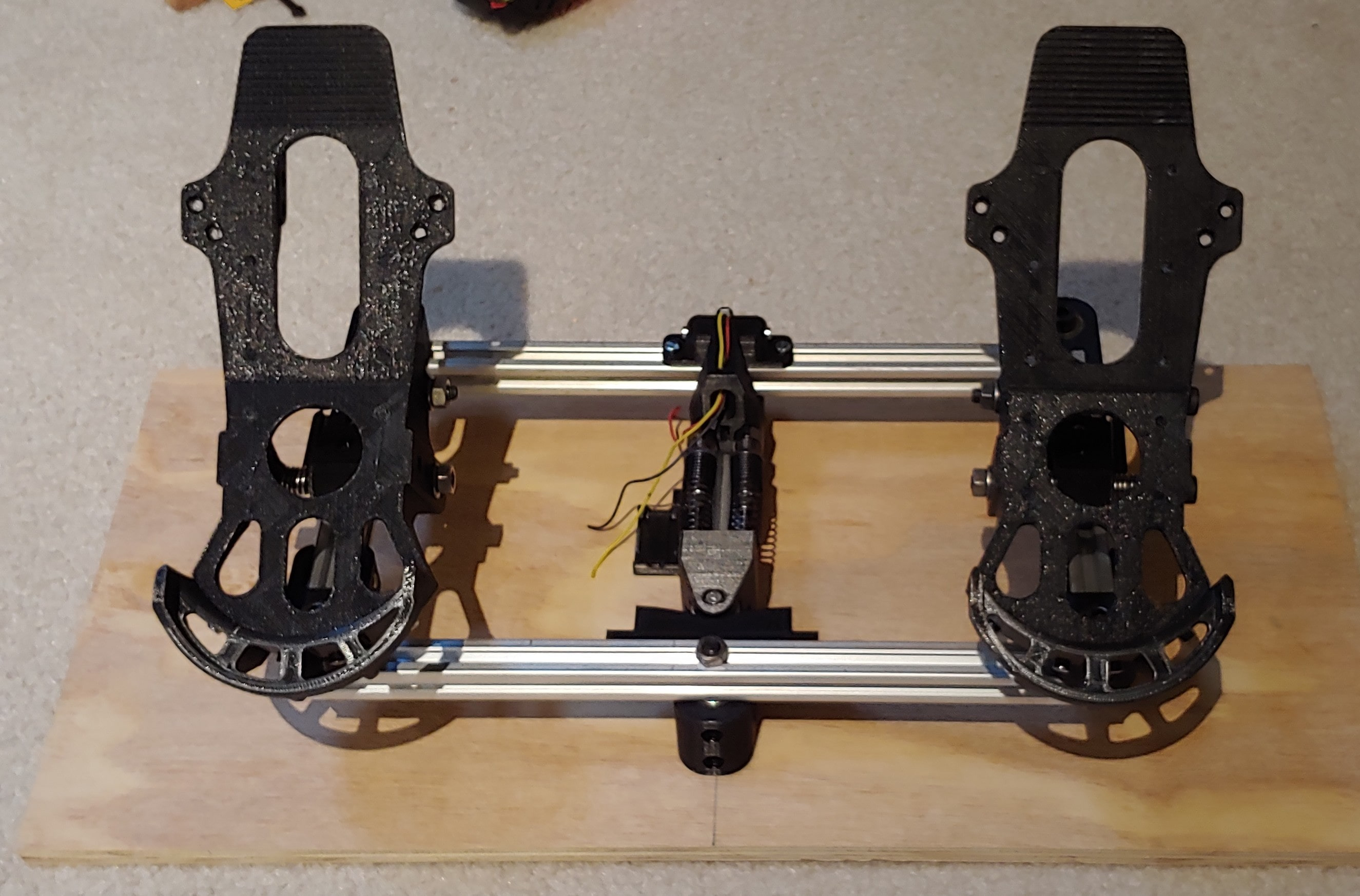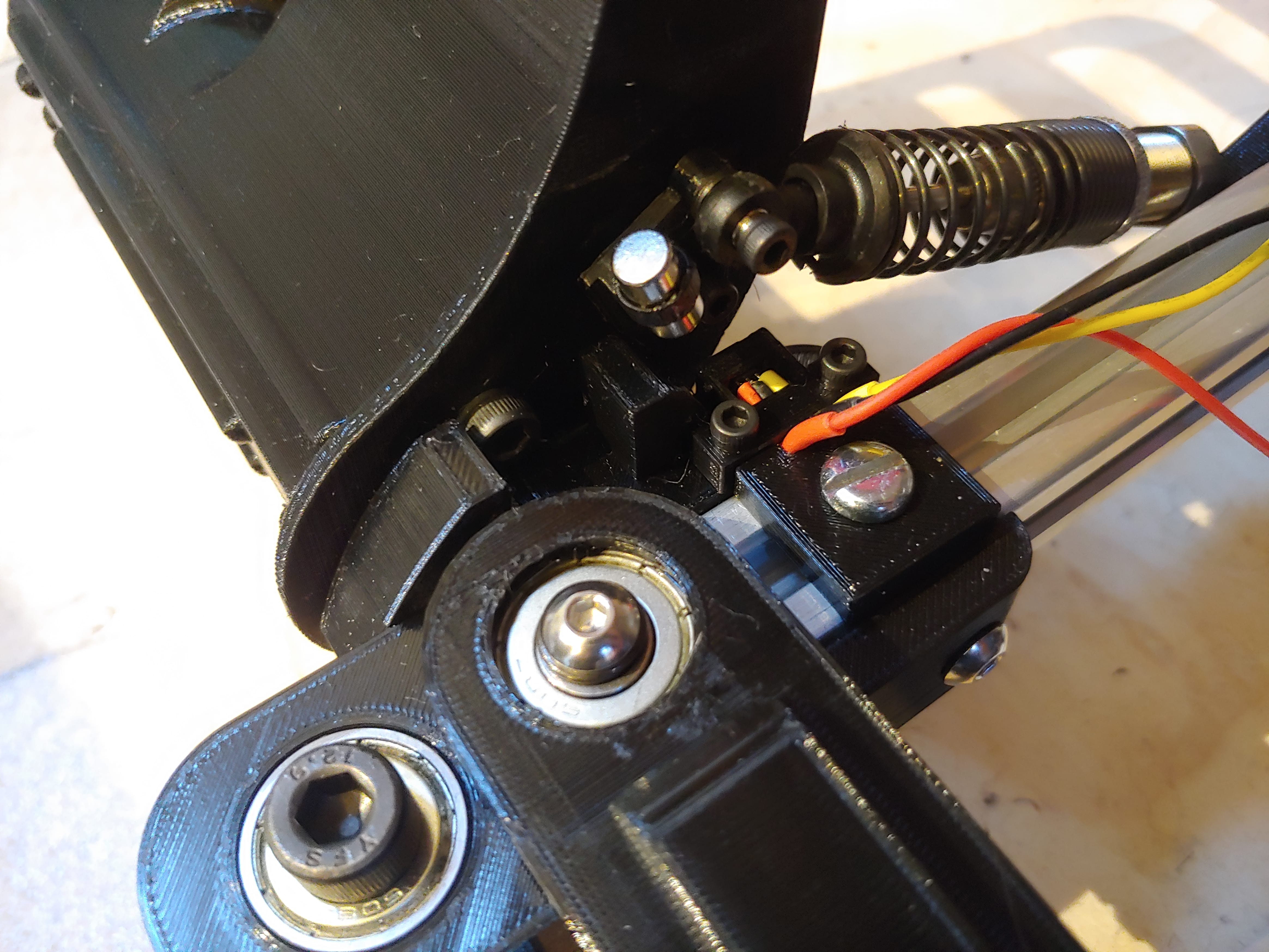 The final modification I made was suggested by that HOTAS discord member. The original design uses a 3D printed part that slides against the aluminum extrusion and pushes against a symmetrical cam for centering with two linearly actuated RC shocks.