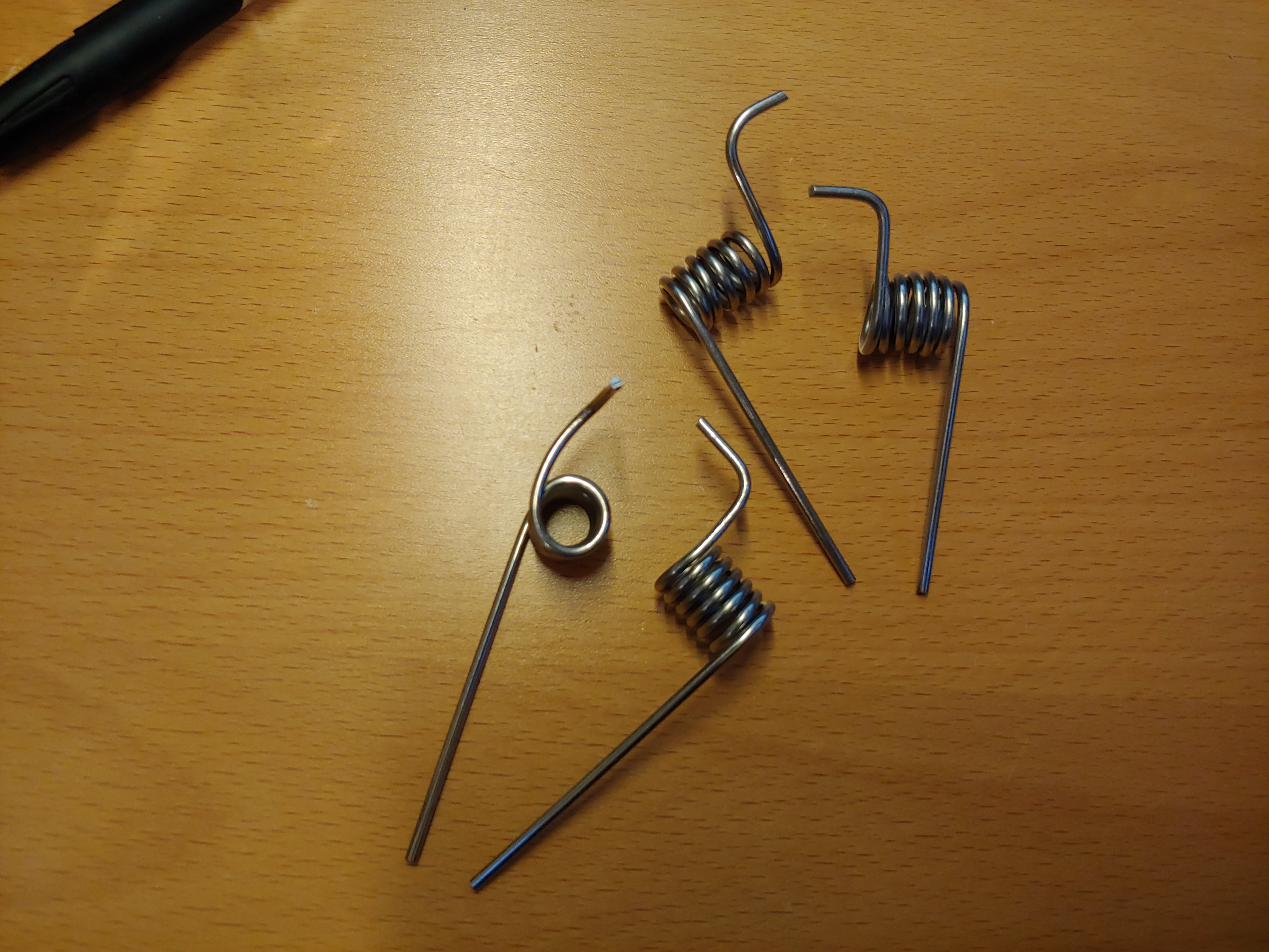 The first version was pretty simple. I just followed the design to the word, using the helpful build instructions PDF and BOM. I ordered the 2020 aluminum extrusion cut to size from ebay, and got a 5mm carbide tip drill bit for drilling M5 holes. I wound my own torsion springs for the toe brakes out of 2mm spring steel rods, as instructed. It did take a few tries, because I was using a very jank setup with a hand clamp instead of a vise.