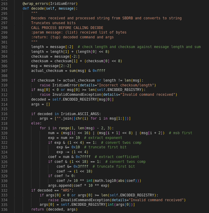 All bytes after the MSN byte are data bytes. Error and announcement messages are primarily encoded as ASCII. Unsolicited numerical is mainly used in proof of life beaconing, which includes statistics about the mission. In the case of non numerical (ASCII) encoding, each of the data bytes will be decoded as a single ASCII character. Each character only corresponds to a single byte, so UTF-8 is not always supported. In the case of numerical encoding, each number is represented as a 3 byte signed float, which allows for 5 significant figures of precision, with exponent from 10^-16 to 10^15.
