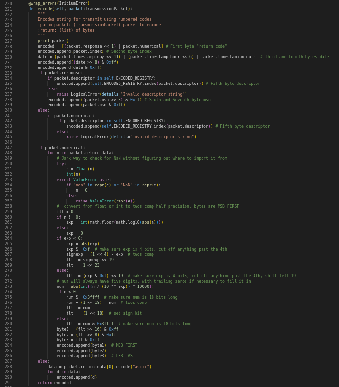 This is one of my proudest contributions to the TJREVERB project, even though it is something that probably happens in industry all the time. A couple months into the year, after we had decided to use Iridium as our primary radio, and had finally set up communications with a groundstation email, I realized that simply parsing data to string and encoding to ASCII was incredibly inefficient, so I designed a protocol to encode numerical data into byte floats, and information about the message such as date and command to as dense a header as possible.