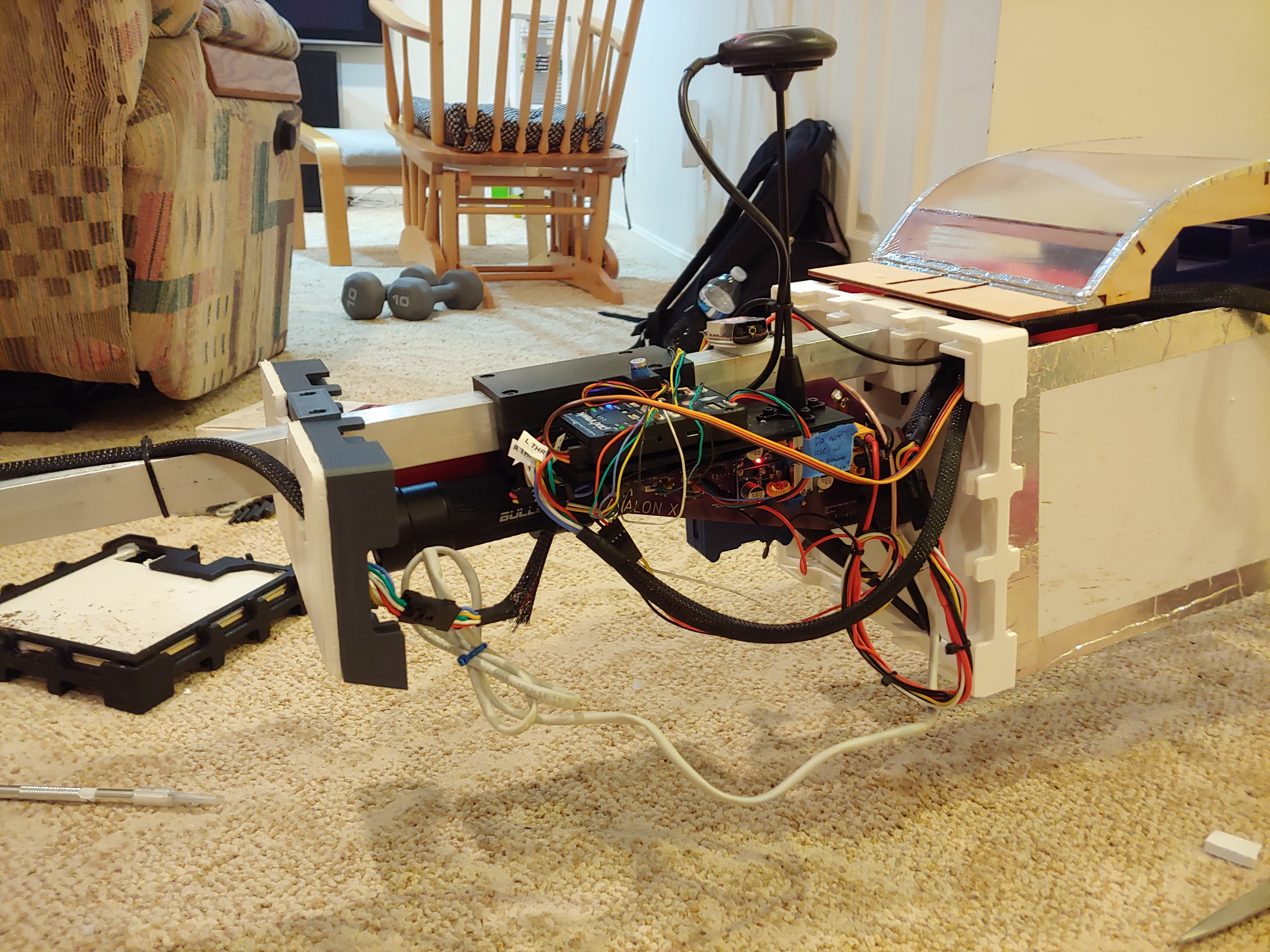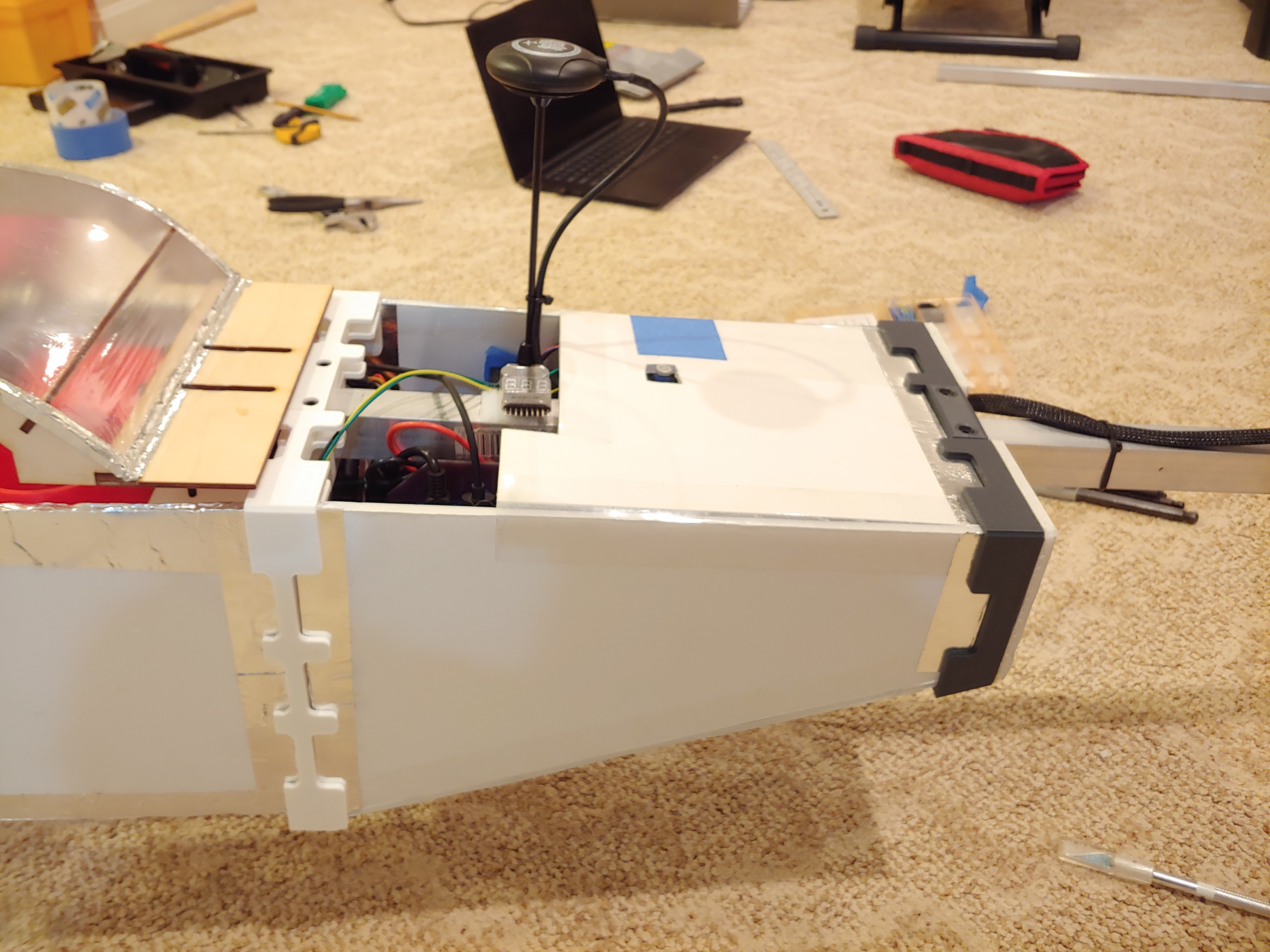 The initial idea with the new Ebay was to remove the tail cone entirely, saving weight, and cutting down on unused space by making the rear bulkhead a half height bulkhead and making the foam paneling angle upwards into it. Another main motivation was to solidify mounting of the electronics. I moved from individual servo extensions to bundling all the connections to the wing, tail, and nose in three sleeved cables with Molex 8 pin connectors on the ends, which cut down on our setup time by making the wiring process as easy as plugging in one connector instead of five or six servo extensions.